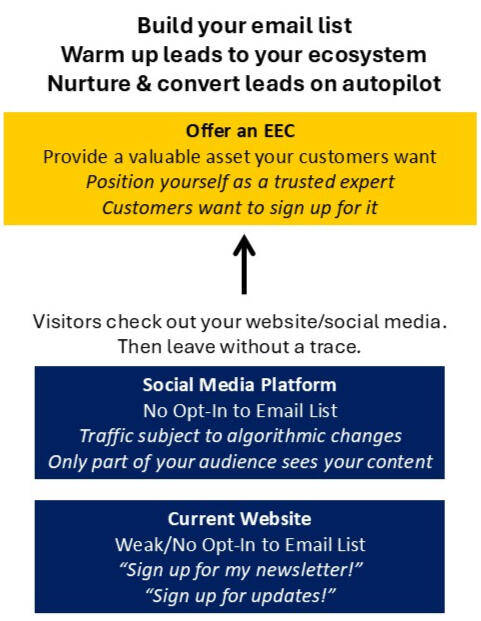 Tired of algorithm changes messing with who sees your content?Lots of engagement on social platforms but your sales are flat?Is your website leaking visitors like a sieve, with nobody opting in to your newsletter?An EEC is the first step in capturing & nurturing valuable leads.Provide prospective clients with a valuable asset, position yourself as a trusted expert who guides clients the outcome they want, and collect leads on autopilot.*Want to see an EEC in action? Take a look at one I put together: Roadmap to the Ultimate Training Getaway